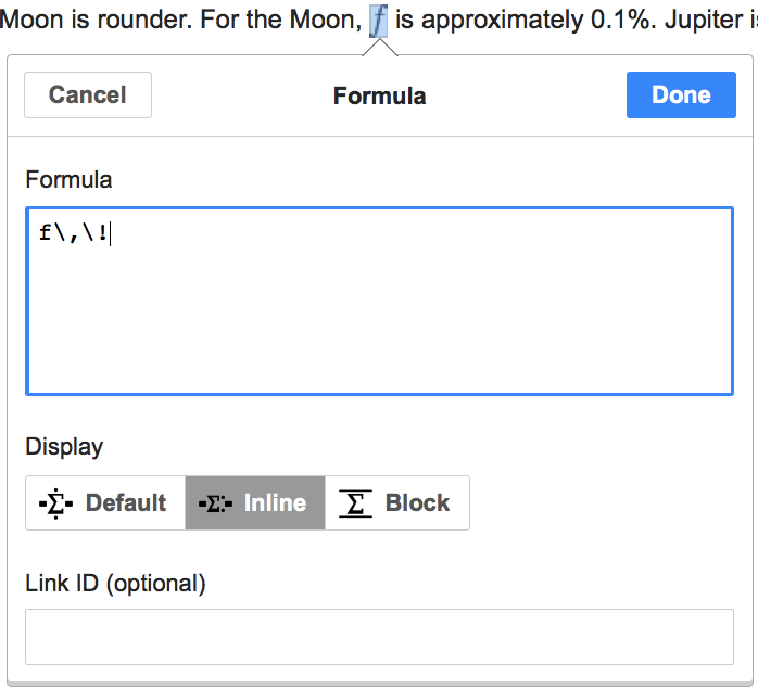 在MediaWiki中,可以选择不同的公式显示方式,具体包括内联模式和块状居中模式。