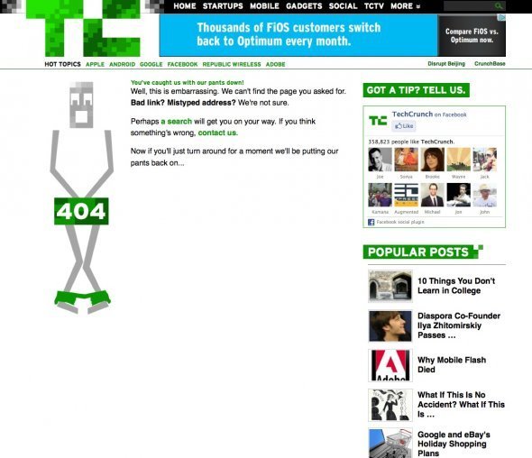 哎呦!TechCrunch科技博客把404页面做成了掉裤子的囧人。
