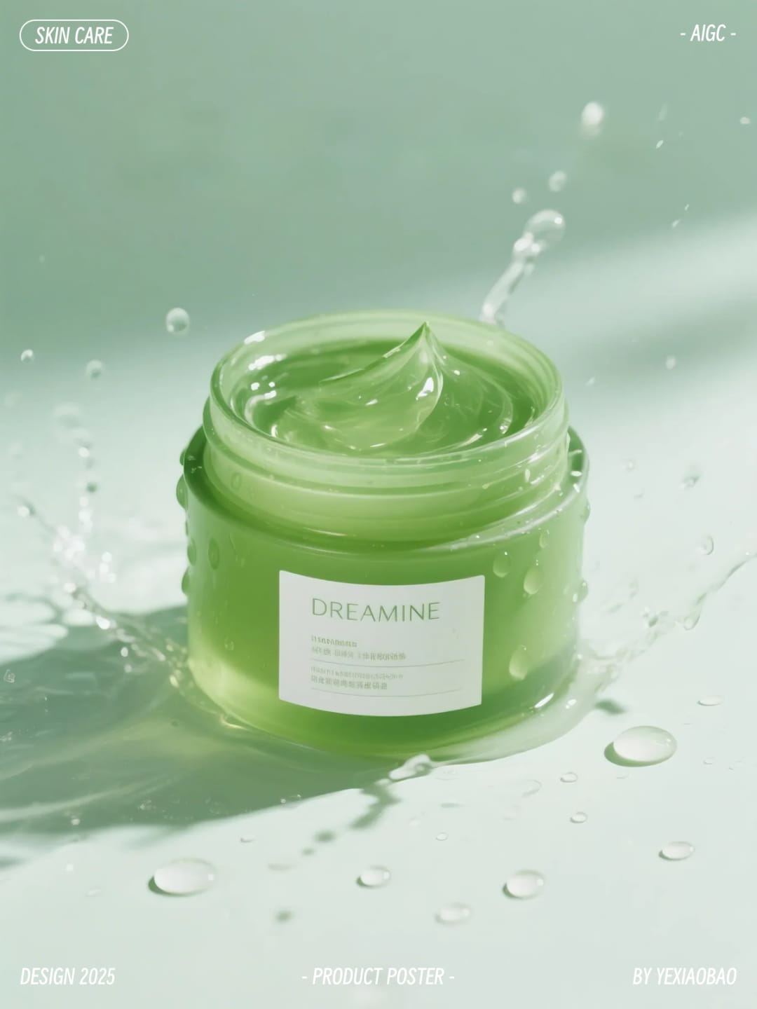 示例提示词:一罐绿色芦荟胶周围飞溅着水滴,罐身上有白色的“DREAMINE”字样。芦荟鲜萃欲滴,旁边点缀着切片芦荟与整株芦荟叶,增添自然气息。整个画面以浅绿色为基调,风格清新自然,突出了产品天然、健康的特点,给人纯净、温和的感觉。采用产品摄影风格,商业摄影手法,特写镜头,极简主义风格,时尚艺术感十足。