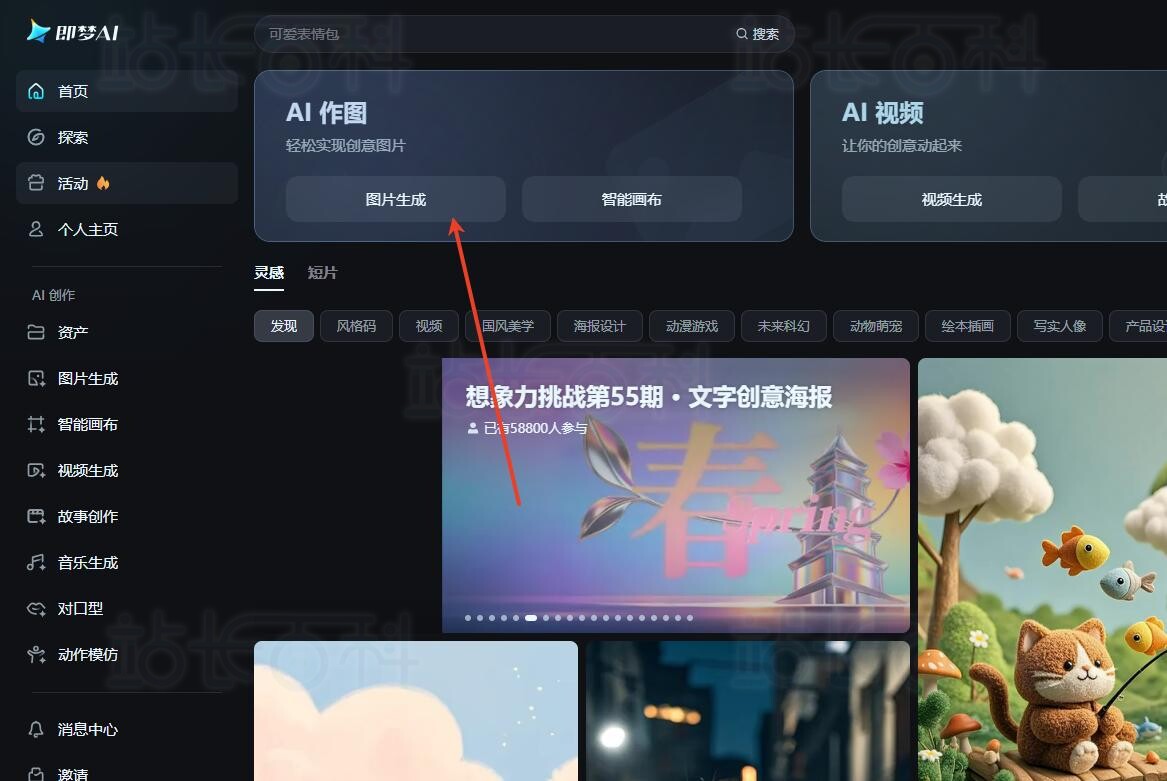 4、在首页导航栏点击“AI 作图”>“图片生成”进入创作中心页面。