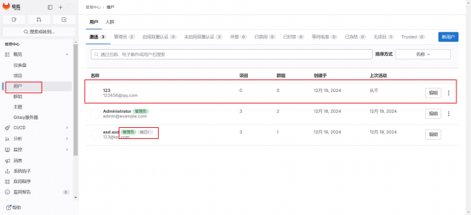 2)进入“管理中心-用户“界面,找到需要修改密码的用户。