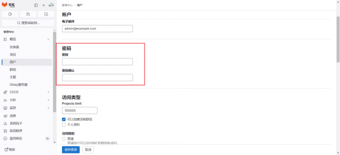 4)输入密码并点击“保存更改“,保存后还需要告知员工其密码已被重置,因为员工使用新密码登录后必须改一次密码才能进入GitLab系统。