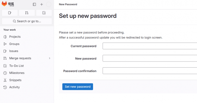 假设我们的浏览器有“记忆“,可以在登录Gitlab账户后点击头像,选择“偏好设置“,找到“密码“选项,并在在“密码“界面,输入当前密码(通过浏览器的记住密码功能查看),然后设置并确认新密码。