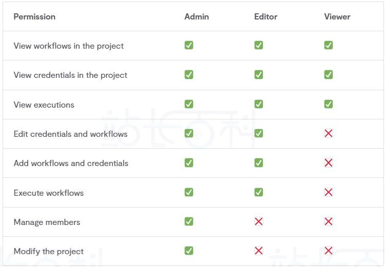 n8n通过角色控制用户在项目中的操作权限,不同角色类型的功能可用性如下: