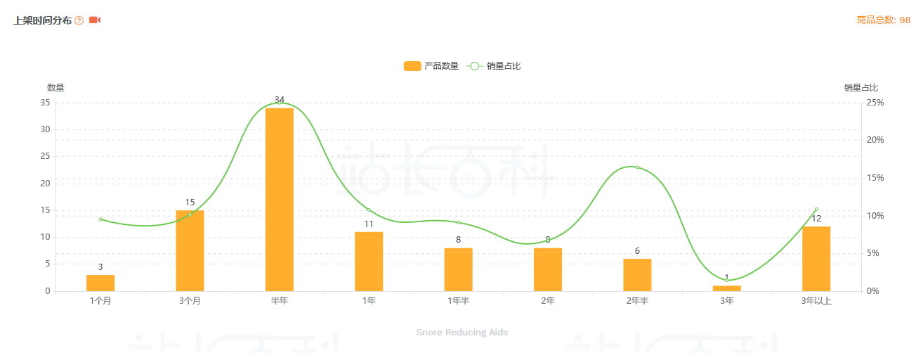 - 上架时间分布:近1年上架的产品销量占比高,说明买家接受新品,新手容易切入;