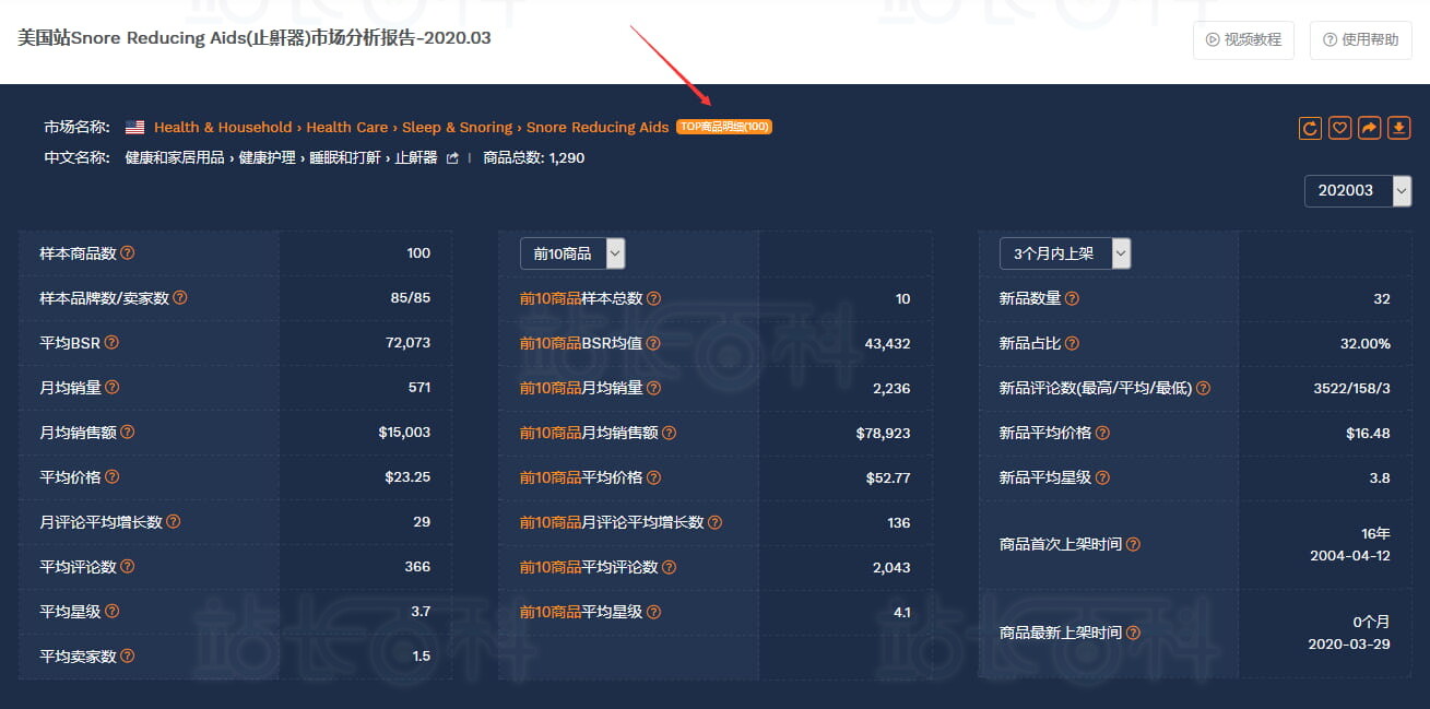 确定进入某个市场后,点击报告顶部链接到查同类产品,看该市场TOP100的商品: