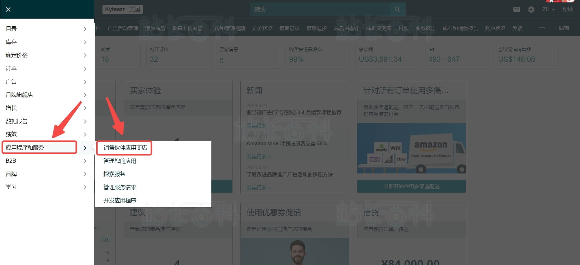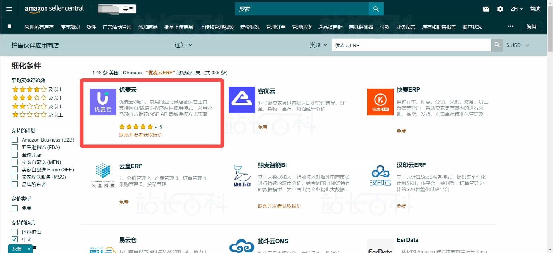 1、登录亚马逊后台,点击打开左上角导航栏,选择【应用程序和服务】,之后选择点击【销售伙伴应用商店】,搜索查找出优麦云,点击进入主页;