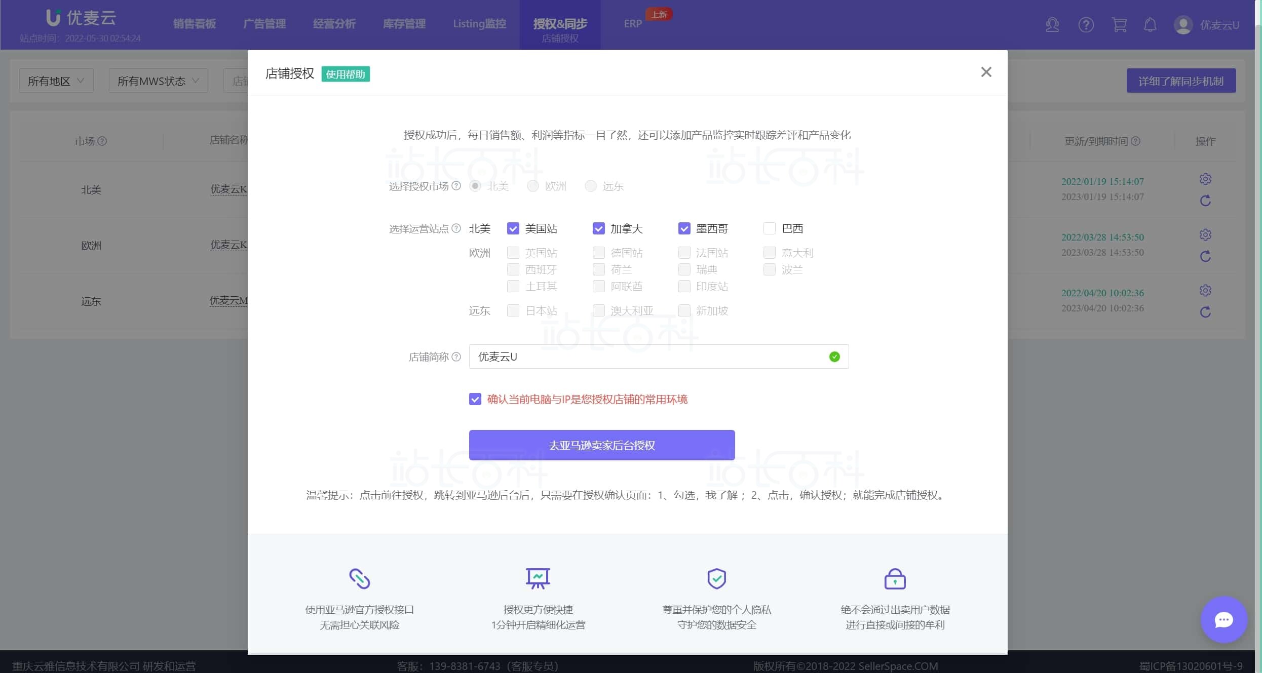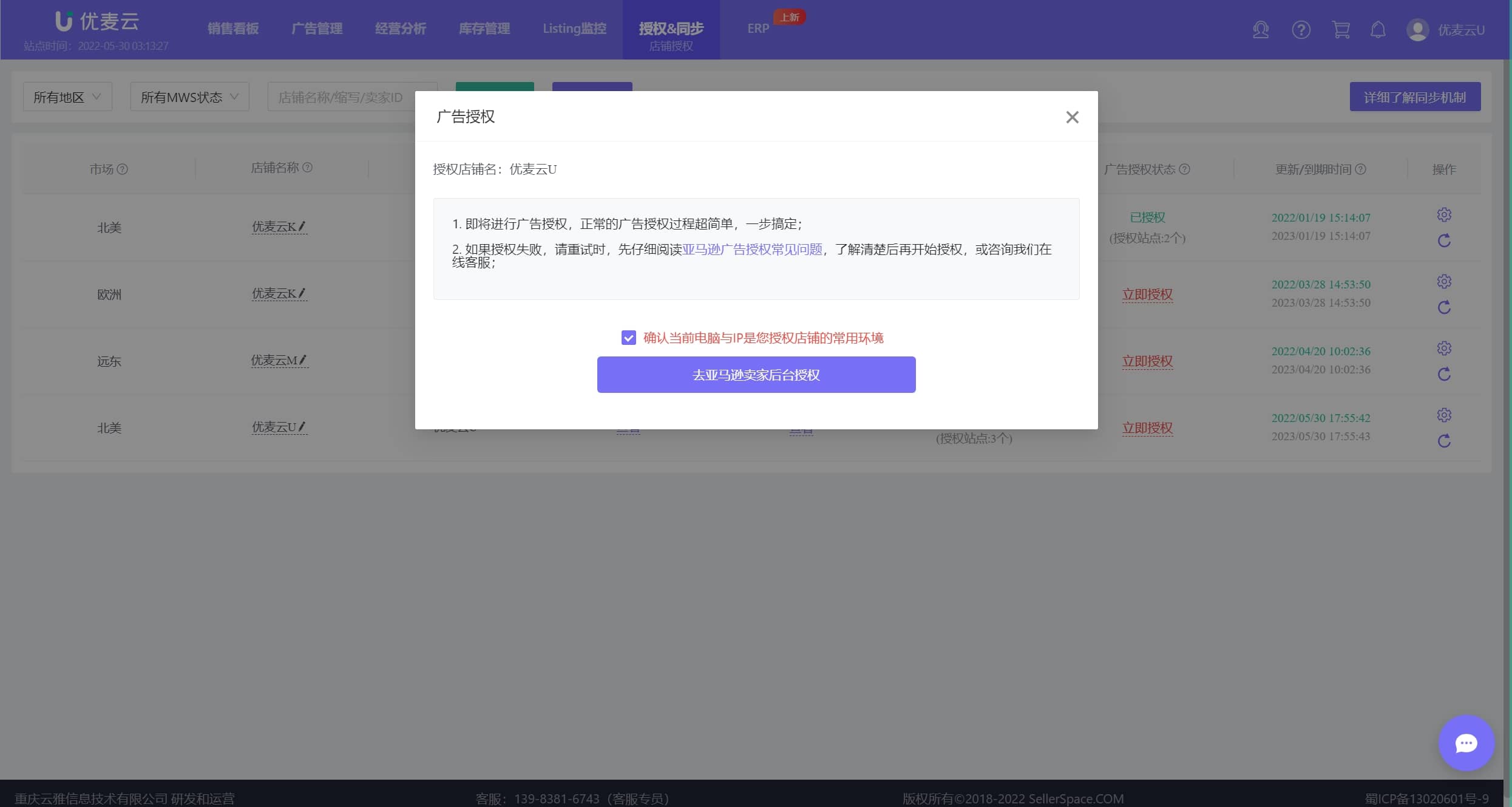 优麦云授权方式分两种:亚马逊应用商城授权 + 优麦云系统授权。授权时都要求操作时IP一致,授权店铺和广告时,务必确保当前登录优麦云的电脑和IP,是您登录这个亚马逊账号的常用环境,以免账号关联。