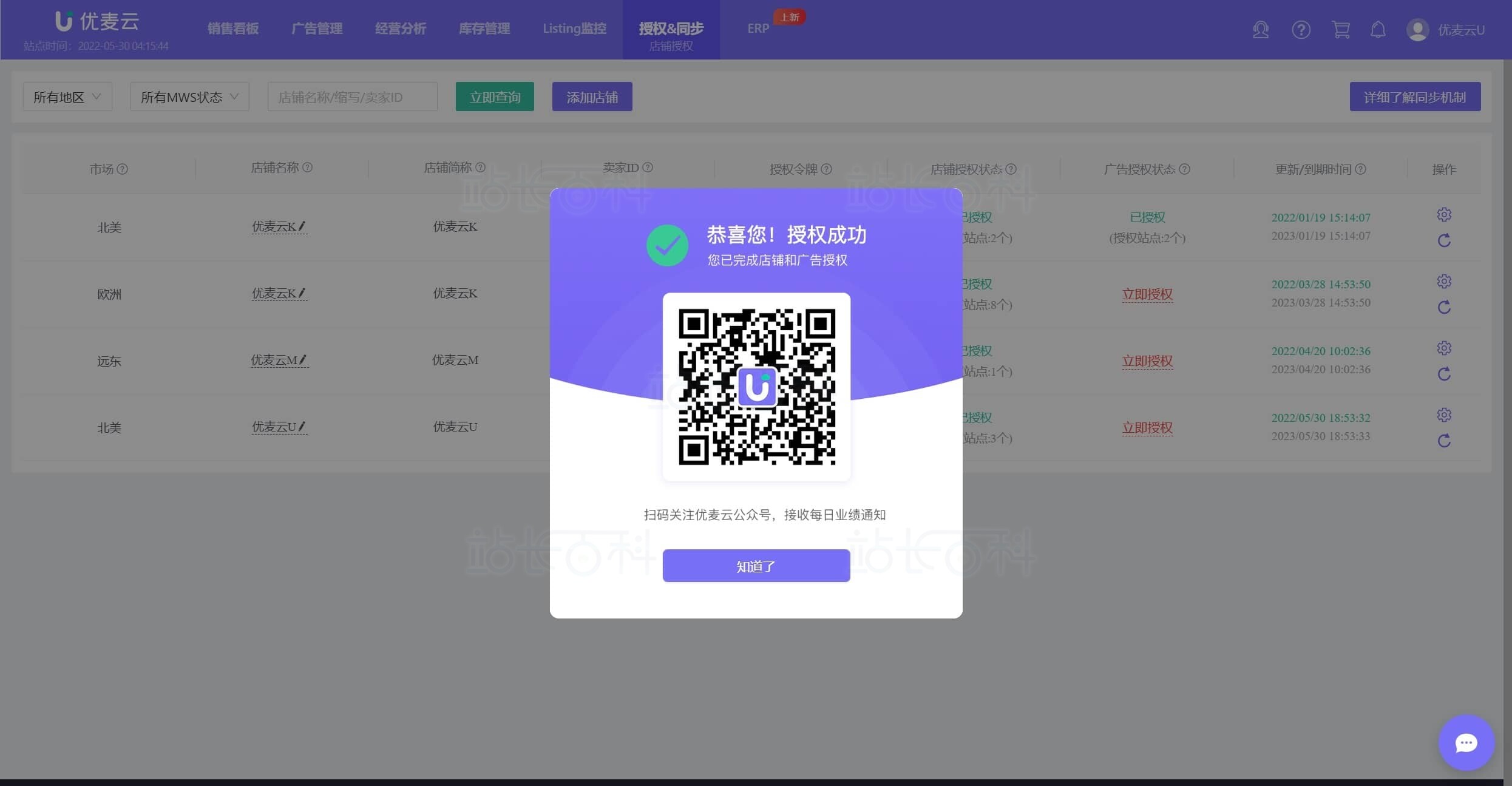 至此,店铺授权与广告授权全部完成!授权成功后,您可以在任意IP环境下登录优麦云,查看店铺数据,调整广告投放!