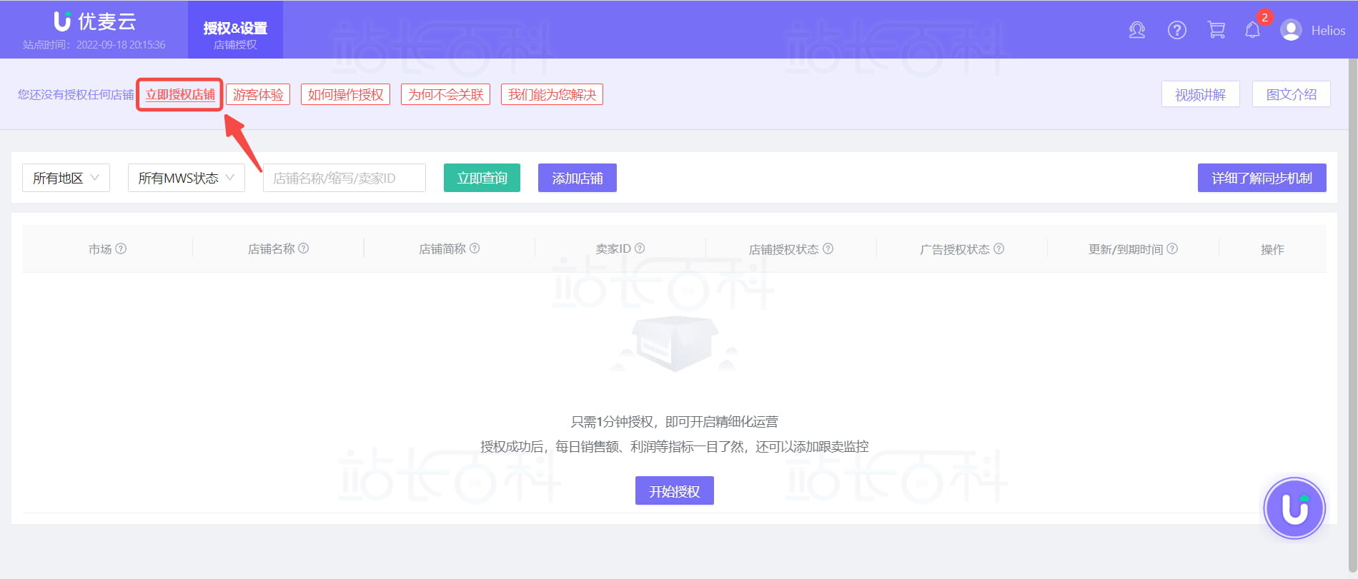 1、在卖家账号所在浏览器,登录优麦云系统,点击【立即授权店铺】 (首次授权),进入授权页面。