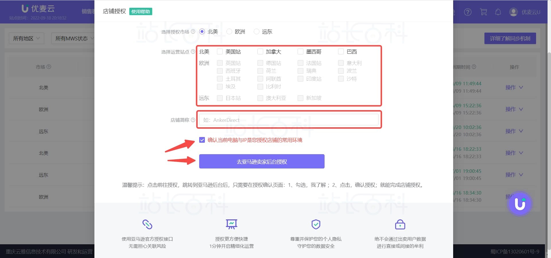 5、登录好优麦云账号后,页面会跳转弹出授权对话框。此时,选择您要授权的市场:北美/欧洲/远东;勾选对应授权站点;输入优麦云中显示的店铺简称(可自定义);确认当前电脑与IP是您授权店铺的常用环境;之后,点击【去亚马逊卖家后台授权】,跳转至亚马逊后台,亚马逊会自动进行授权;