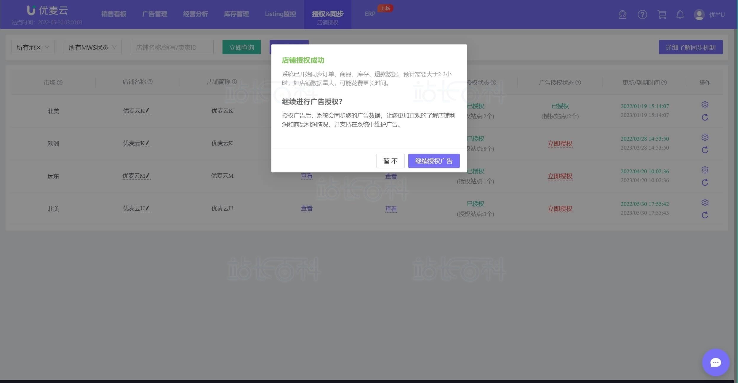 5、页面提示 “店铺授权成功”,即表示您已成功授权您的店铺,店铺数据会在2-3小时后同步至优麦云后台,如果店铺数据量较大,可能花费更长时间。而现在,您可以选择继续进行广告授权。点击“继续授权广告”按钮,进入设置。