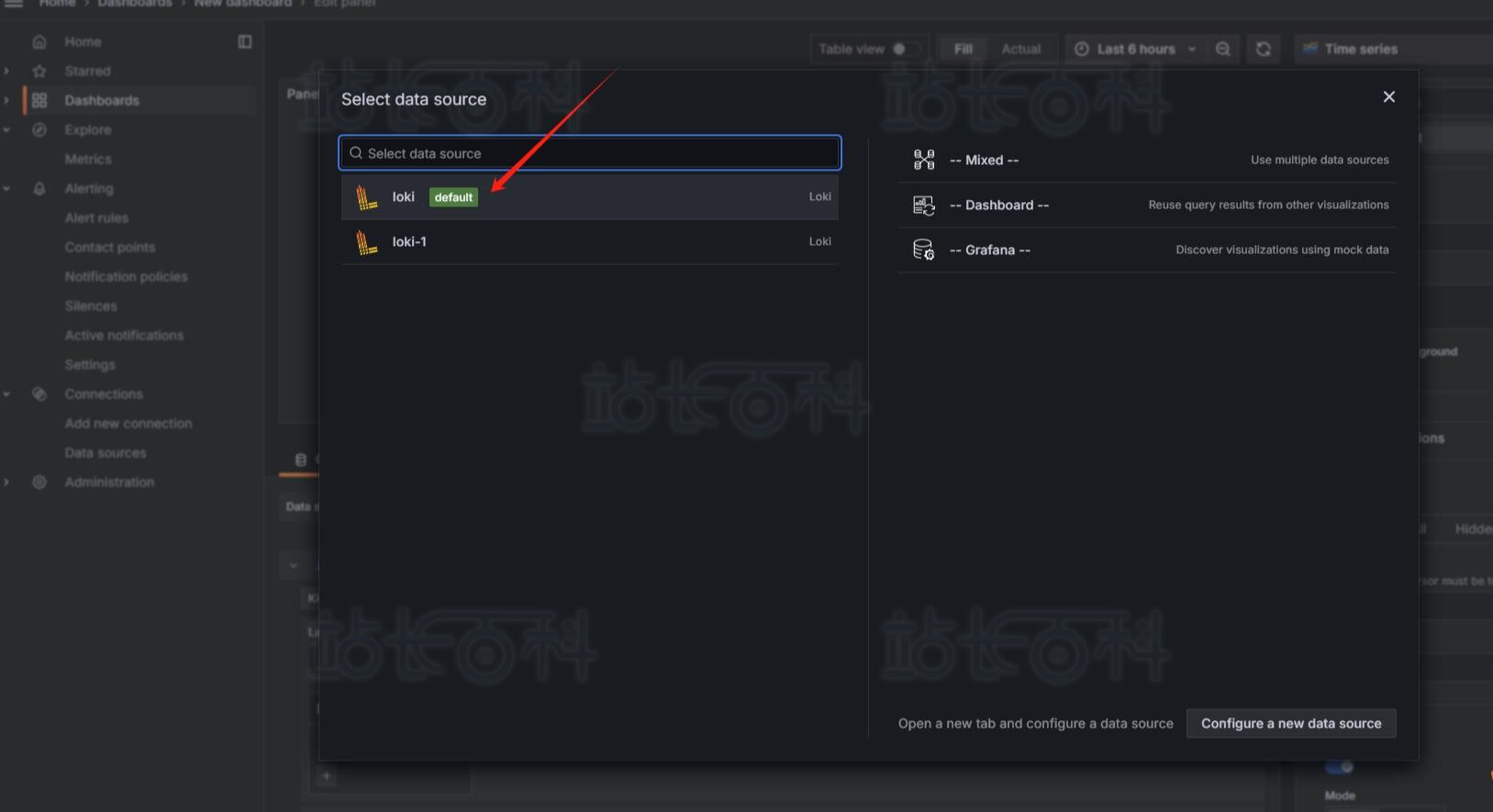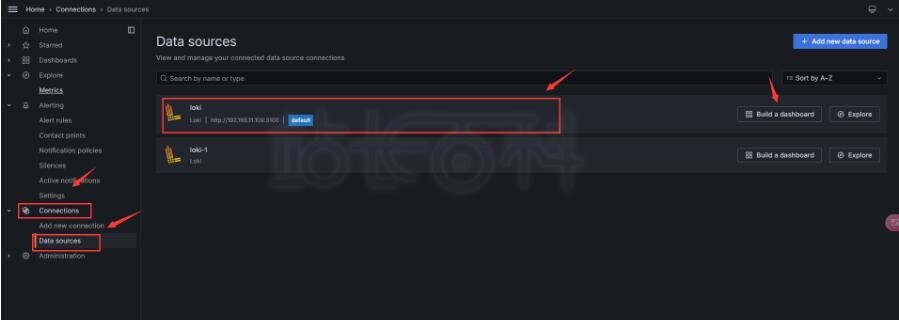 添加 Loki 数据源:点击 Add data source,搜索并选择 Loki