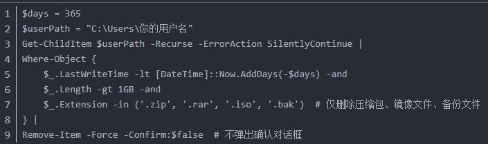 比如清理用户文件夹里超过 1 年、大于 1GB 的大文件(脚本可自定义时间和大小):