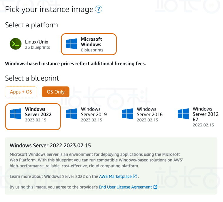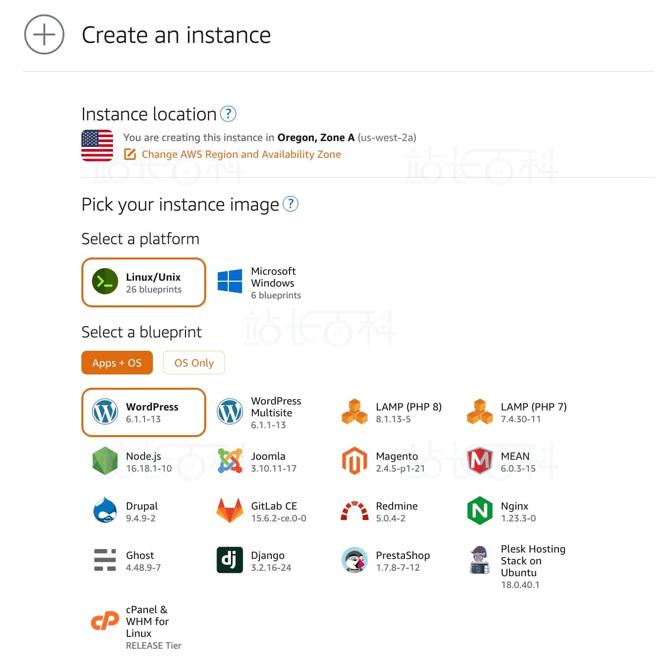 Create an instance(创建实例)页面包含多个选项。首先,选择Instance location(实例位置),可以保留默认值,也可以选择最近的亚马逊云科技区域。其次为亚马逊免费VPS选择Windows Server,然后选择OS Only(仅限操作系统)Windows Server蓝图。