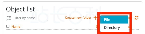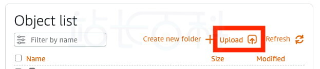 Object list(对象列表)显示存储桶中的对象。点击Upload(上传),将应用程序和部署文件放入该存储桶。