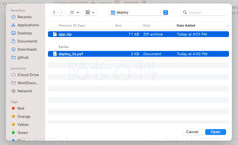 从./practical-cloud-guide-code/run-to-build/windows-app-deploy /deploy/中选择app.zip和 deploy_iis.ps1,然后点击Open(打开)。