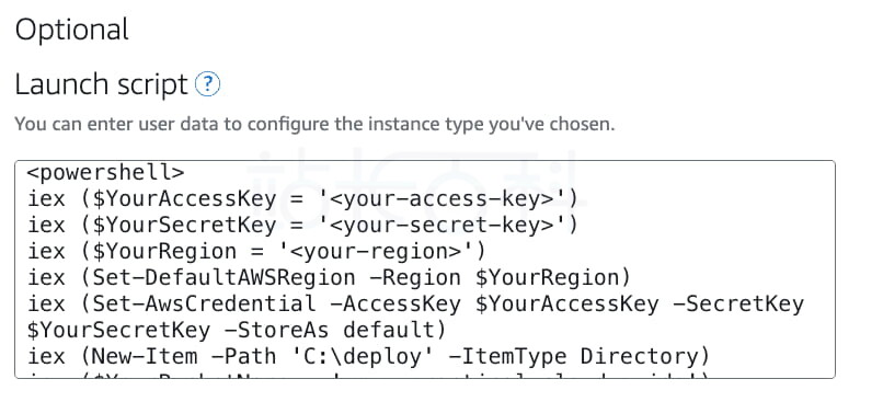 添加一个脚本以创建目录,并下载应用程序和部署脚本。将此脚本复制到Launch script(启动脚本)输入框中。将访问密钥、安全密钥和区域的值替换为账户。