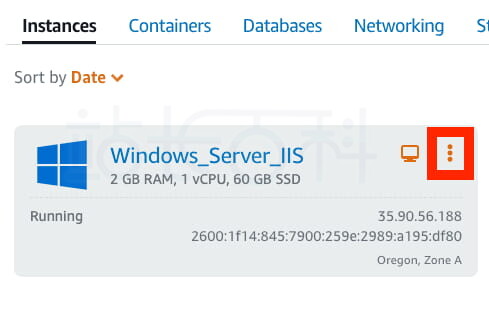 在Lightsail菜单中选择Instances(实例),然后选择三个红点。