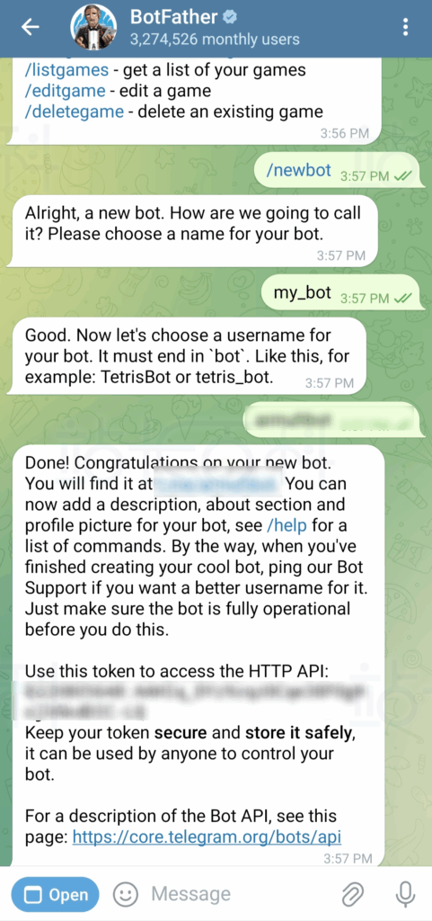 - 选一个用户名,必须是独一无二的,而且要以bot结尾,比如:my_n8n_bot或n8nTaskManagerBot。