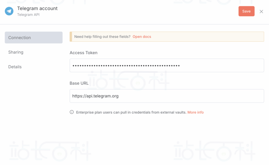 3、在“访问令牌”字段中,粘贴从BotFather收到的令牌。