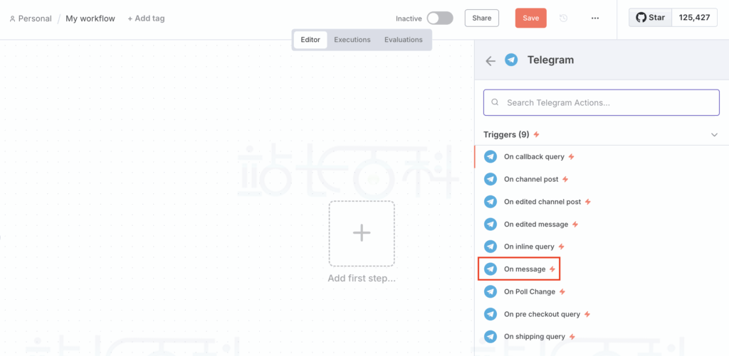 1、创建新的n8n工作流,点击画布编辑器上的“添加第一步”。