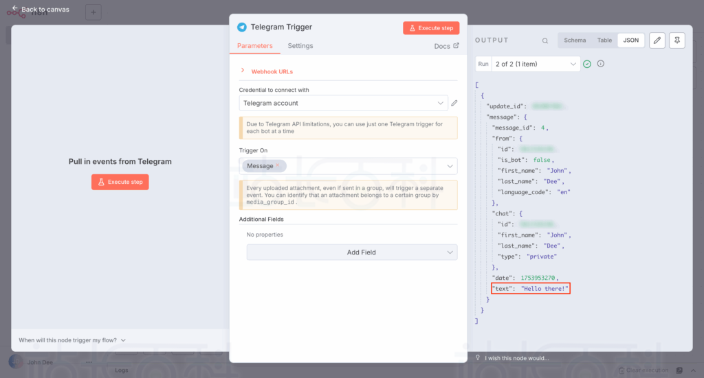 你应该能在Telegram触发节点右侧的JSON选项卡中看到响应,里面会显示相同的消息数据。