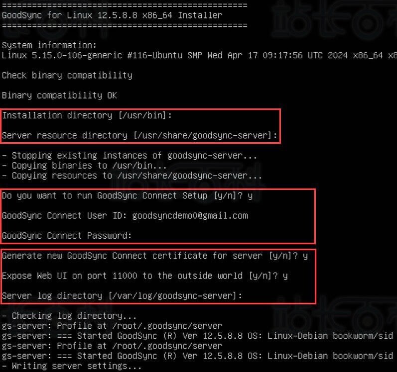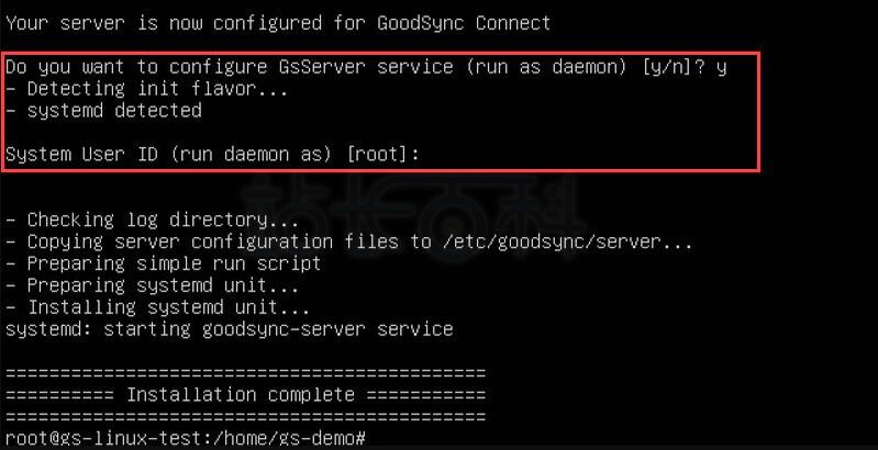 - 提示 “为服务器生成新的GoodSync连接证书” 和 “在端口11000上启用GsServer Web UI” 时,均输入y并回车;