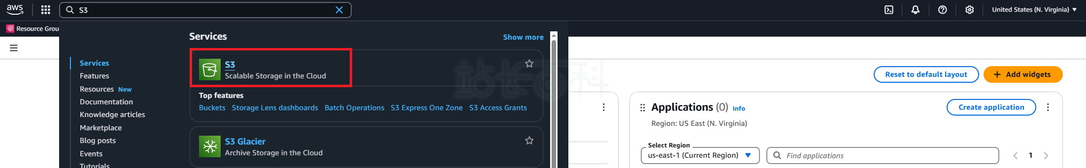 1、登录亚马逊云科技(AWS)后台后,在控制台顶部搜索栏中输入“S3”,点击进入 Amazon S3 控制台。