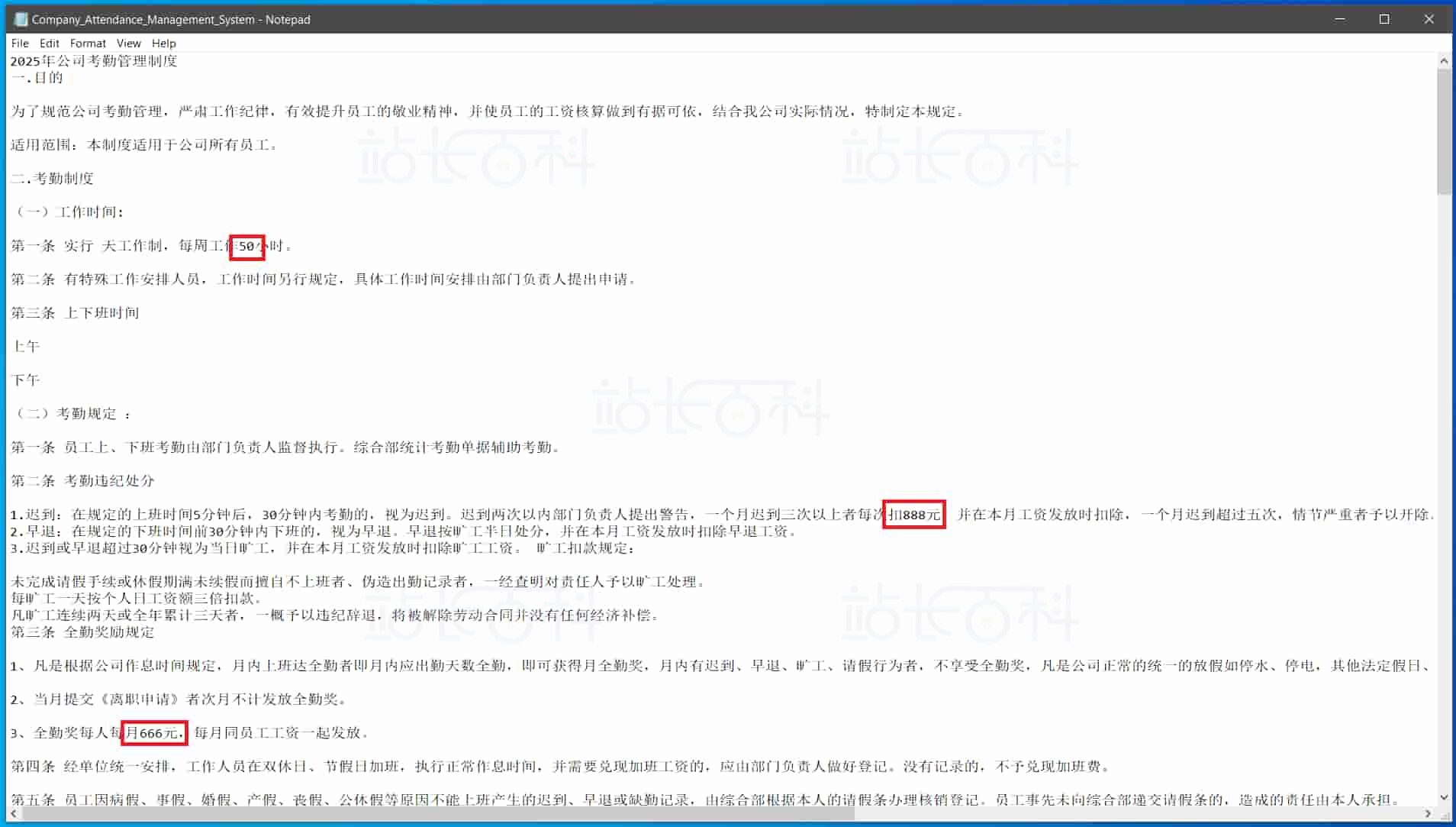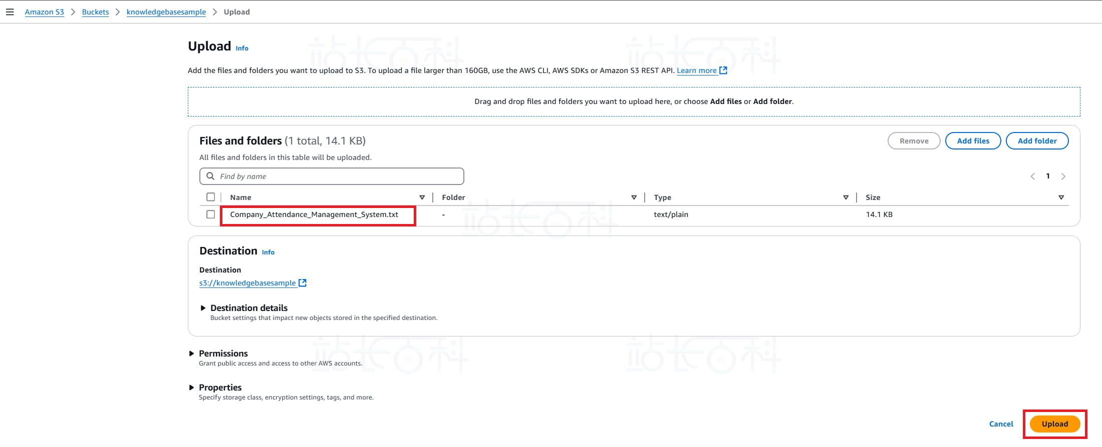 例如将一份 txt 格式的 “2025 年公司考勤管理制度” 上传到 S3 存储桶(其中做了一些自定义设置,以便于验证知识库调用)。