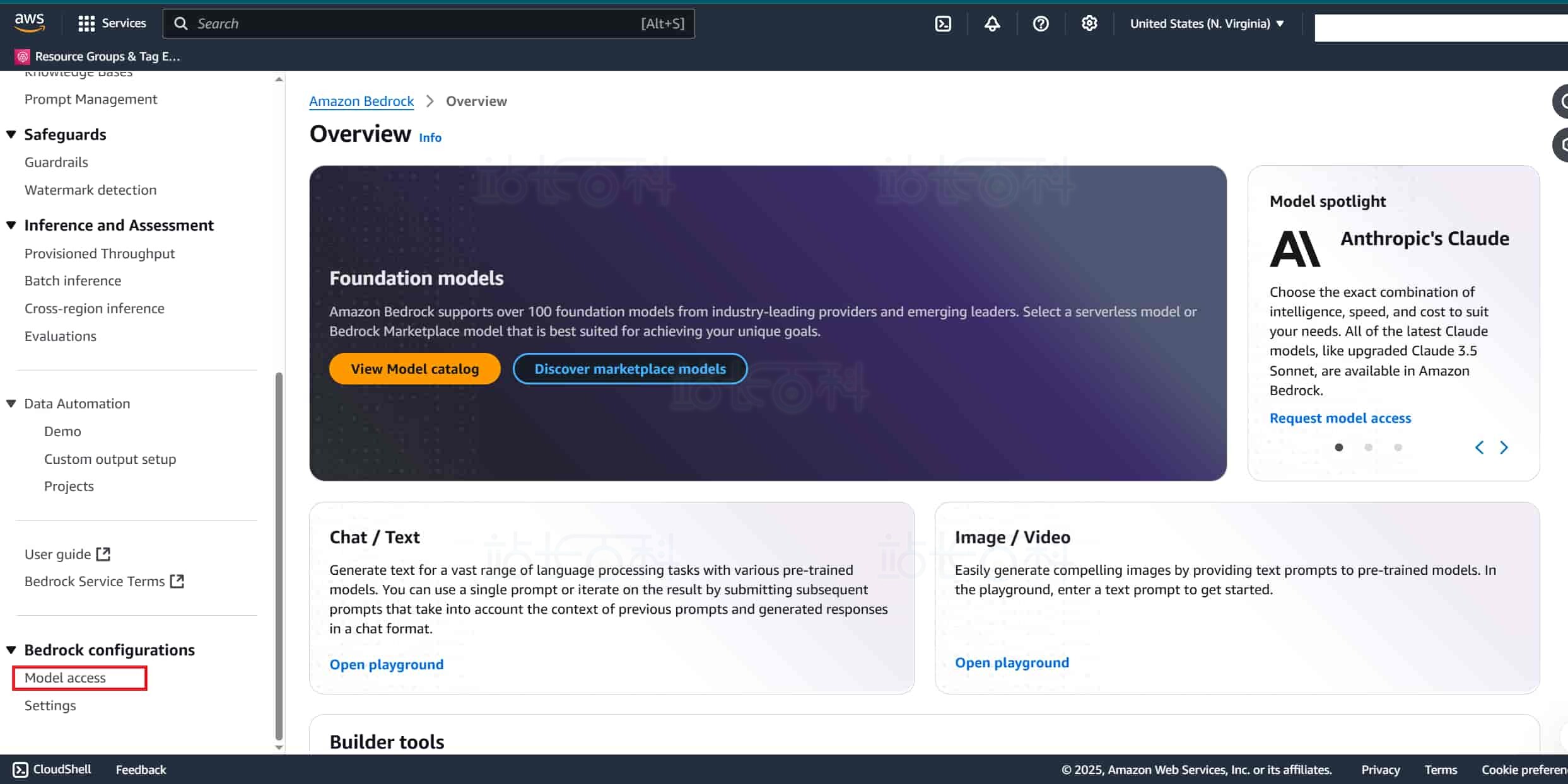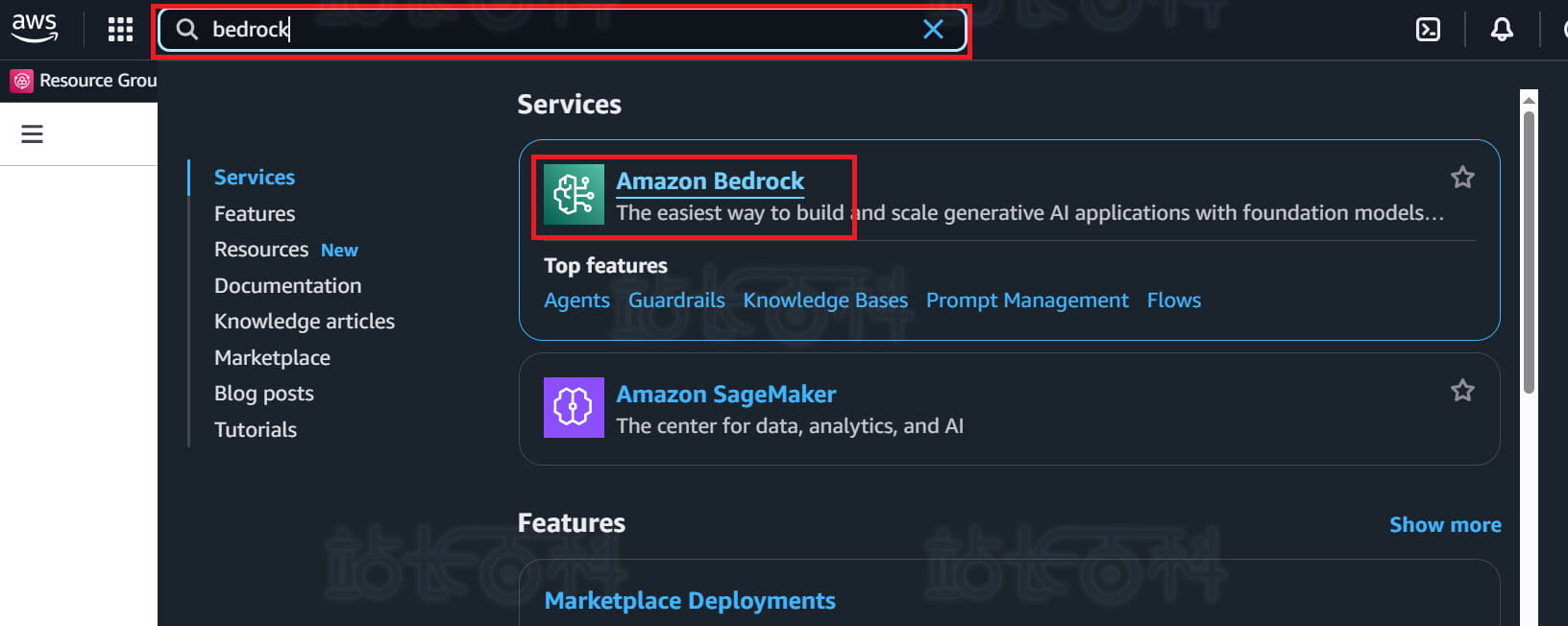 1、在 AWS 控制台的搜索框中输入 “Bedrock”,然后点击 Amazon Bedrock。