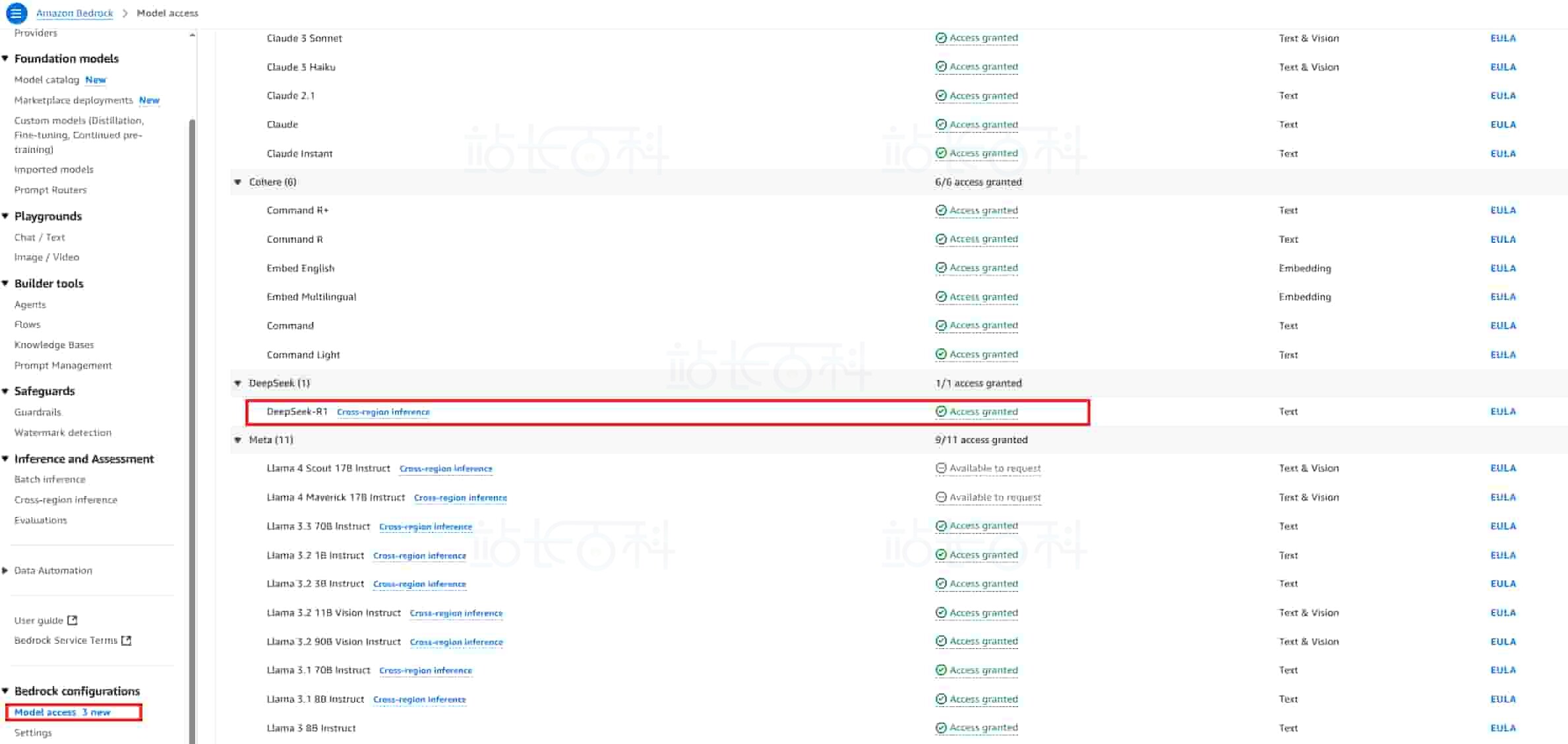 2、进入 Amazon Bedrock 页面后,找到页面中的 “Model access”(模型访问)设置板块,仔细检查自身账号是否已具备 DeepSeek 的使用权限。