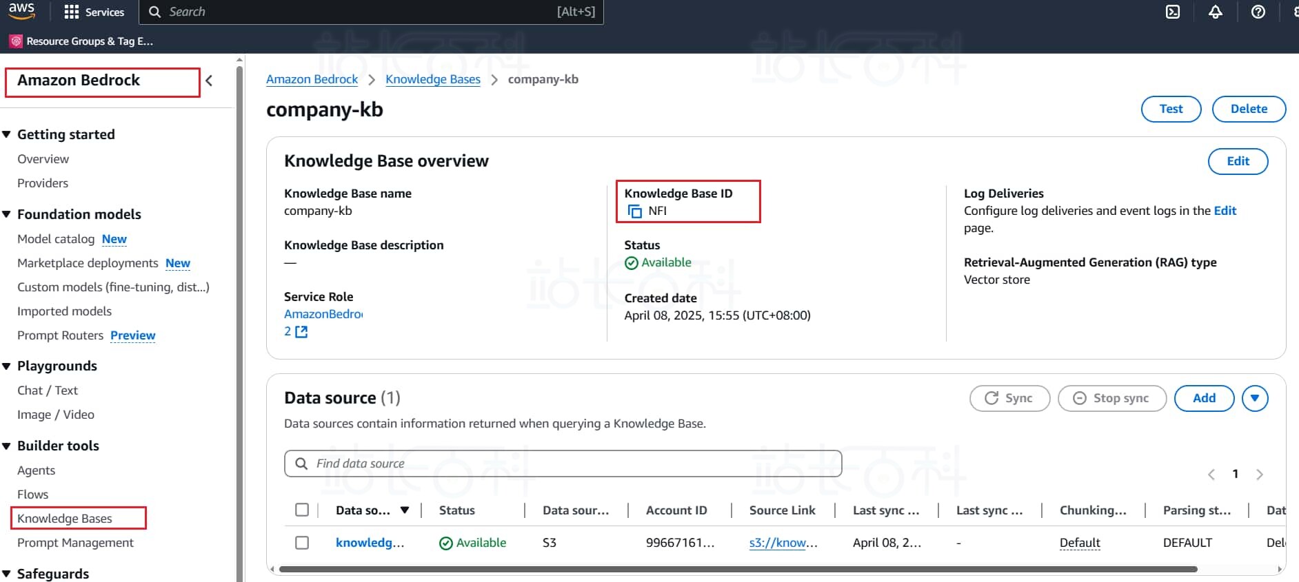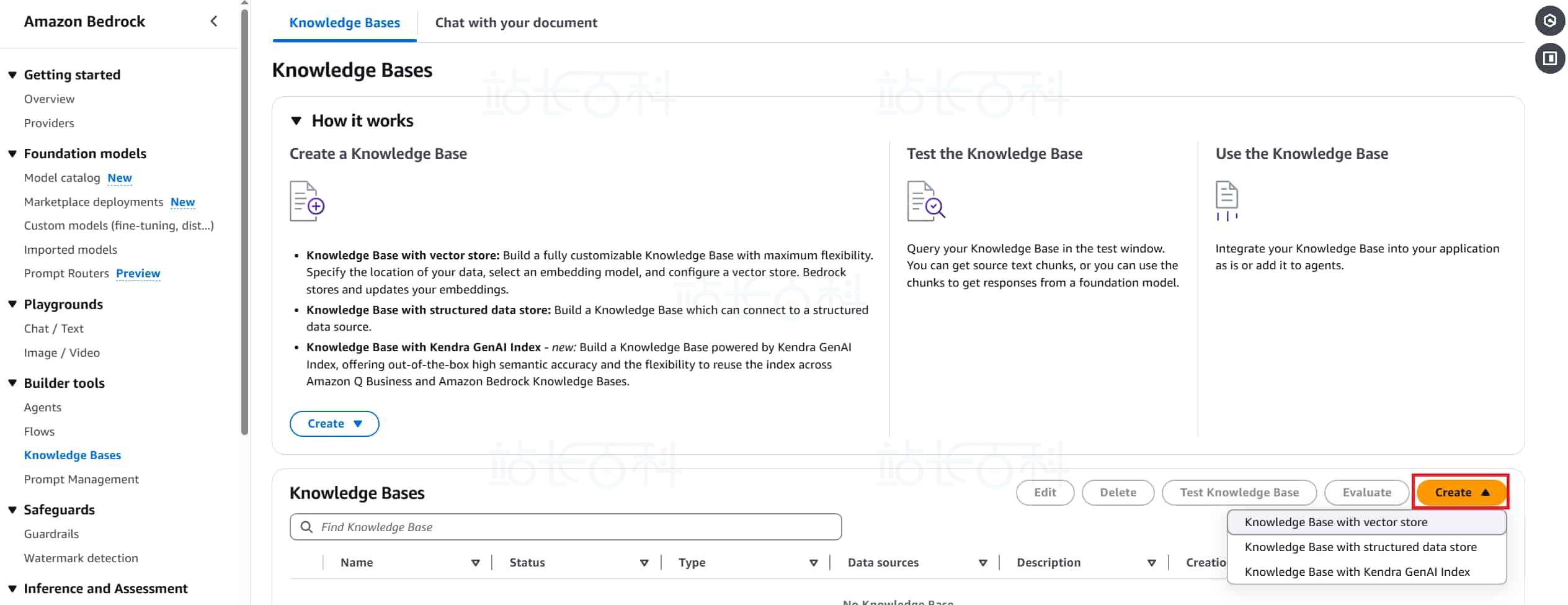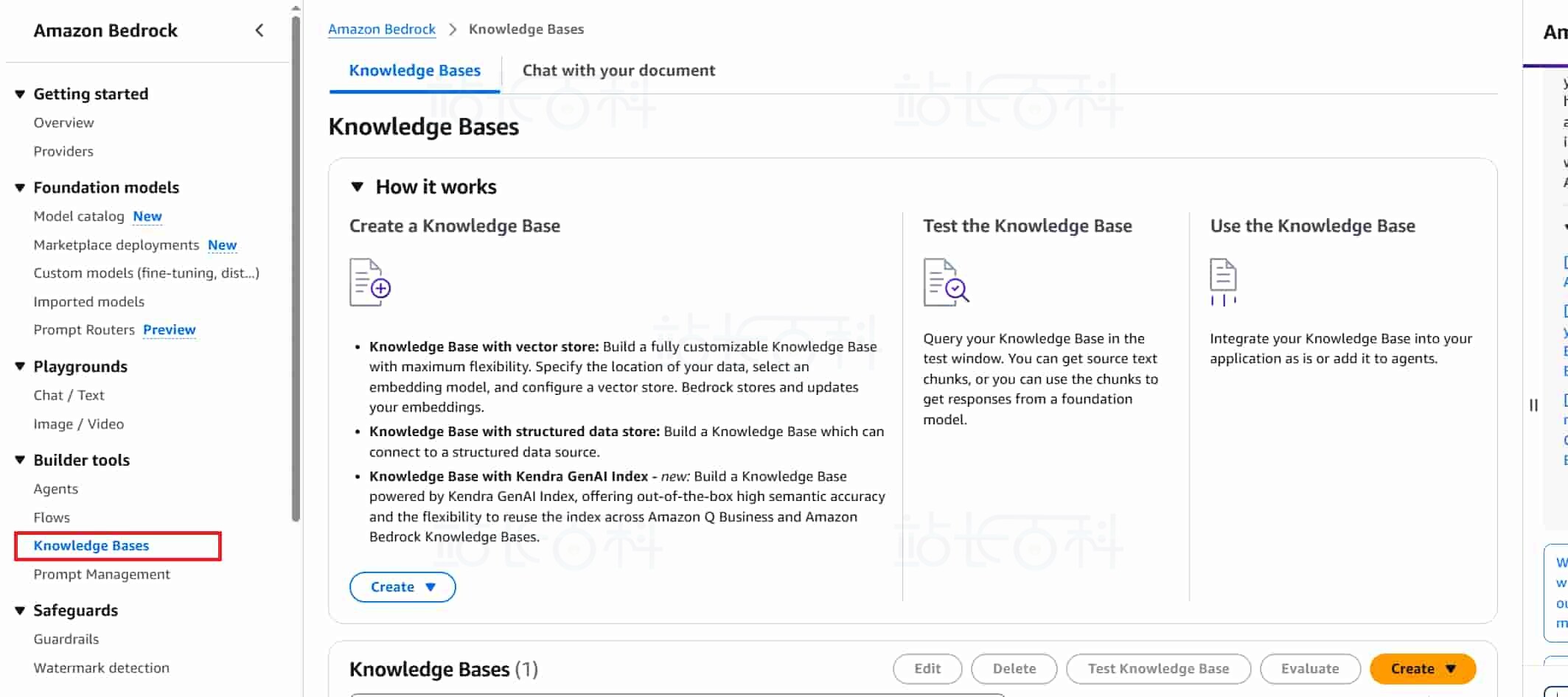 1、返回 Bedrock 控制台,点击左侧【Knowledge Base】(知识库),进入知识库管理页面。