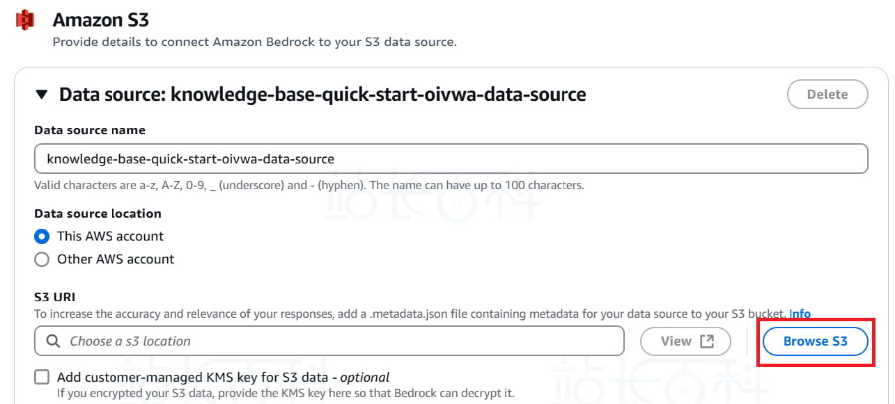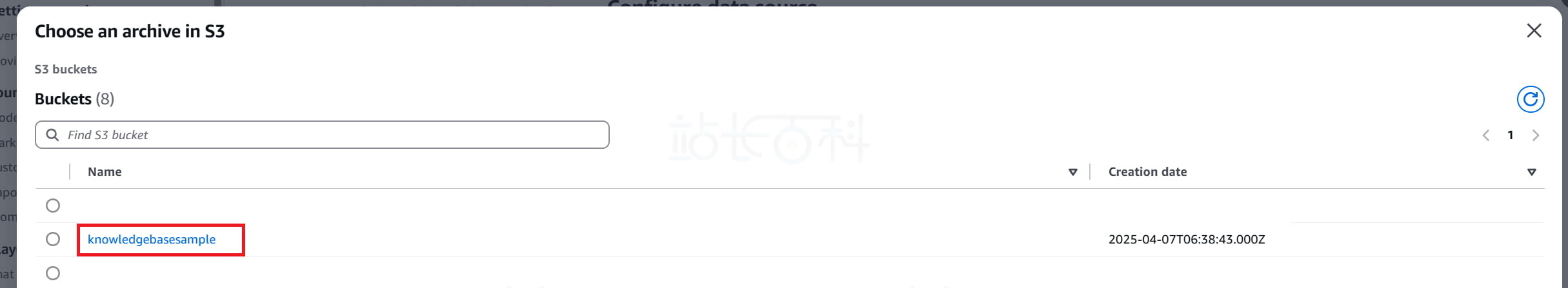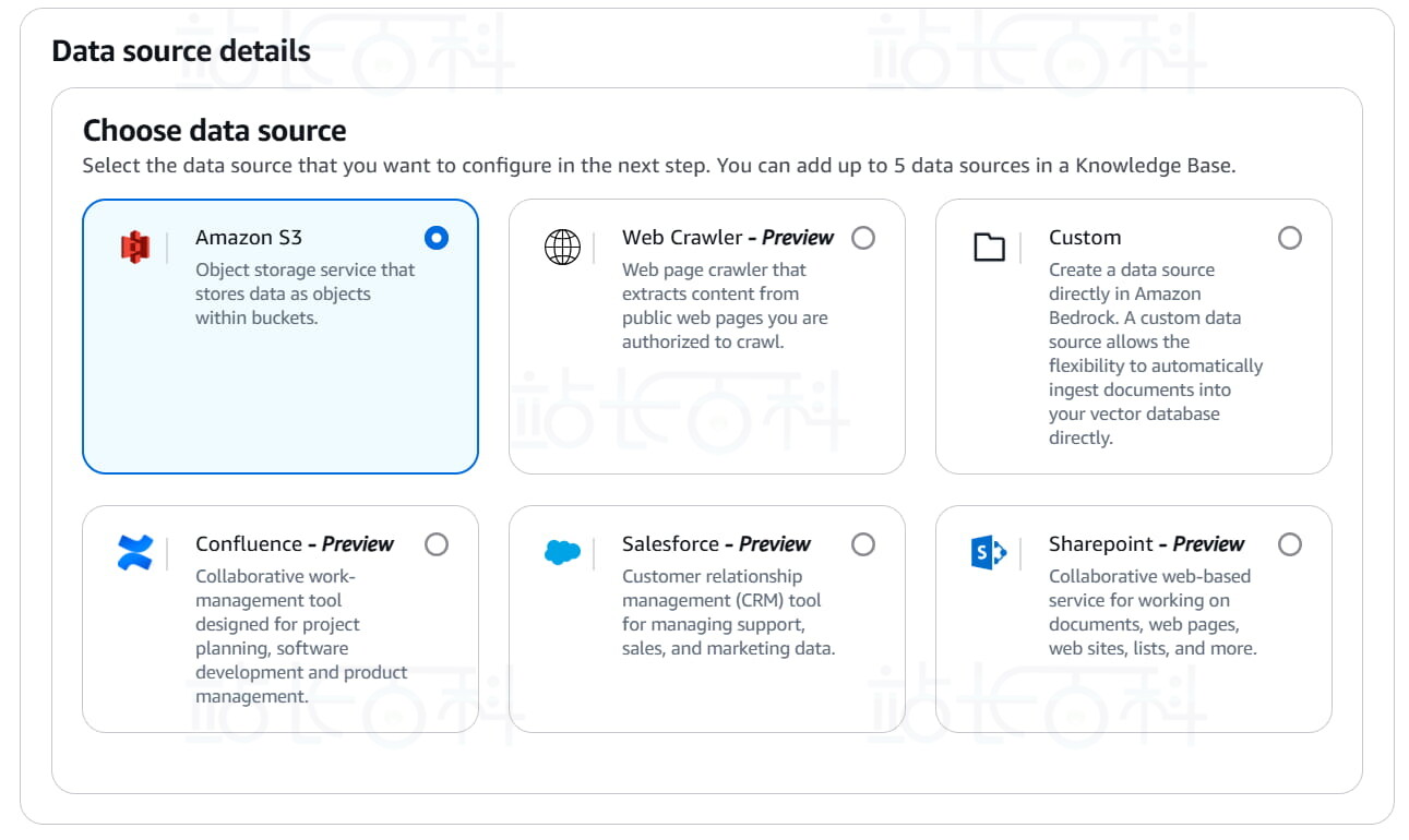 4、设置知识库数据来源:选择 S3,因为要连接到我们刚才上传的 S3 存储桶。