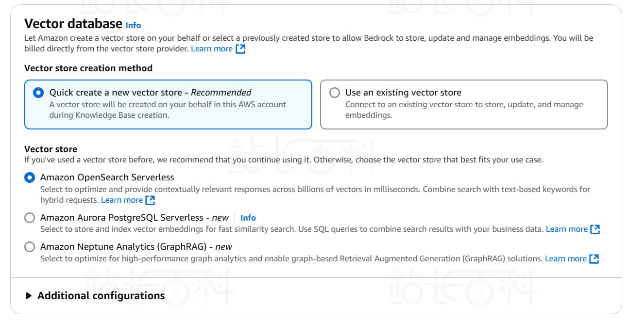 11、设置向量存储:这里可以保留默认 (Amazon OpenSearch Serverless)。
