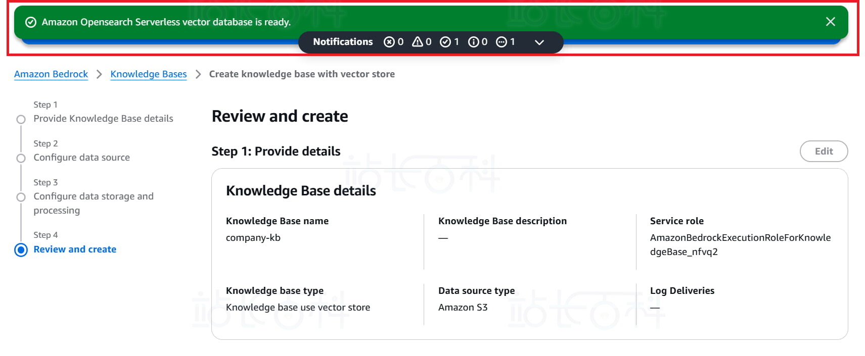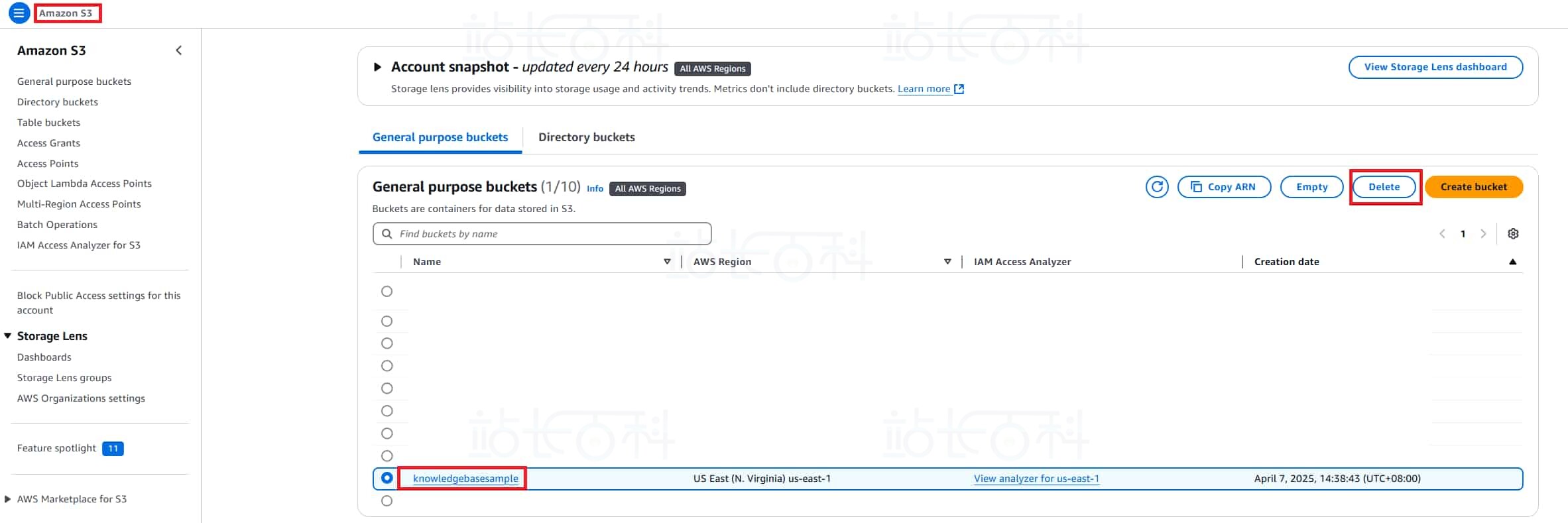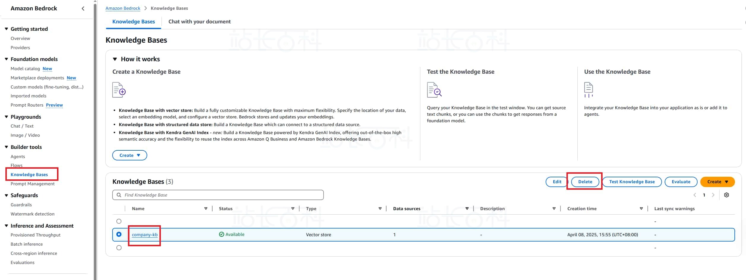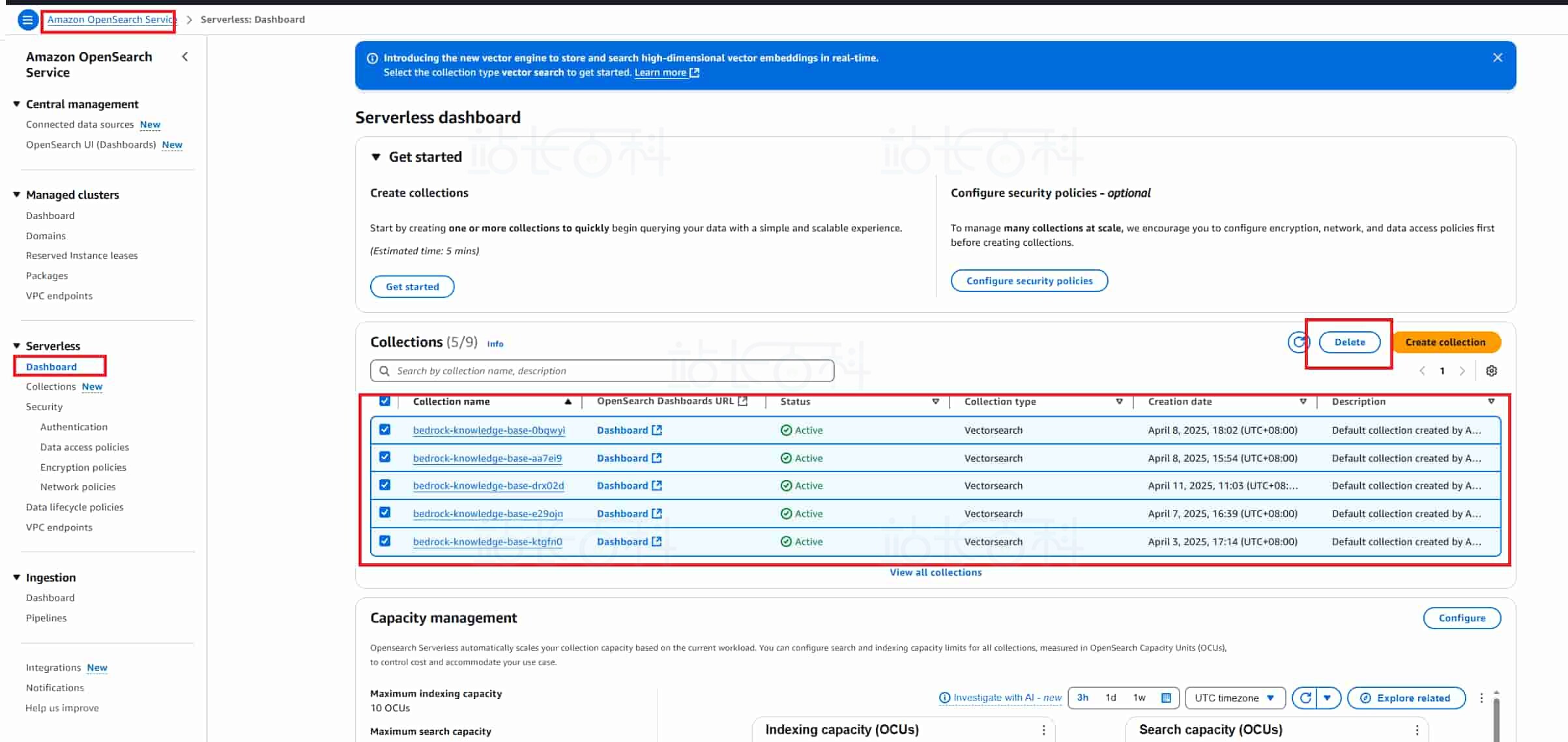 Amazon Bedrock 控制台中的 Playground 属于即开即用型服务,使用完毕后无需额外退出操作即可结束会话,无需担心资源占用问题。但需要注意的是,知识库底层依赖的 Amazon OpenSearch Serverless(用于向量化数据的存储与检索)会单独计费。因此,如果确定短期内不再使用该知识库,建议按照以下顺序清理资源,以避免产生不必要的费用: