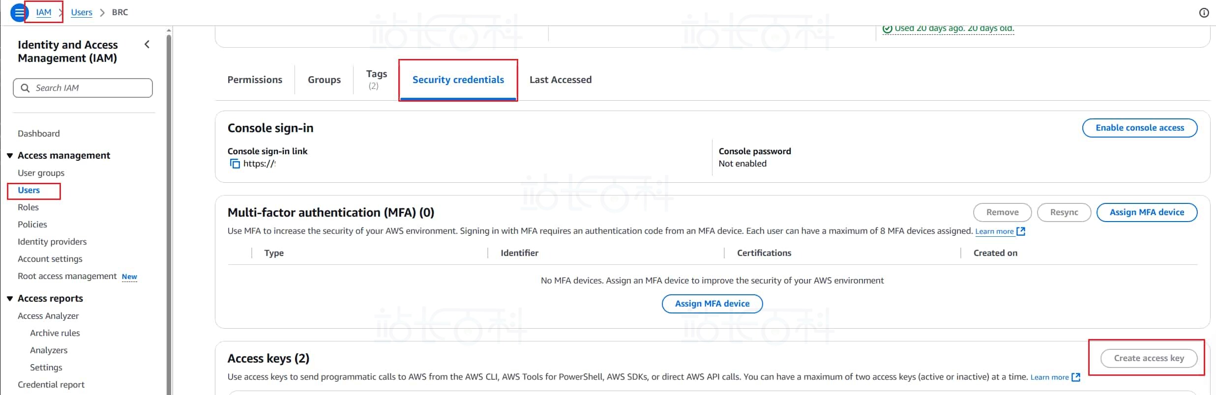 7、以上这些信息可以在 AWS 的 IAM 中获取或者新建 access key。