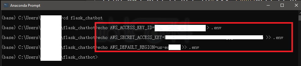 echo AWS_SECRET_ACCESS_KEY=xxx (你的SECRET_ACCESS_KEY)>>> .env