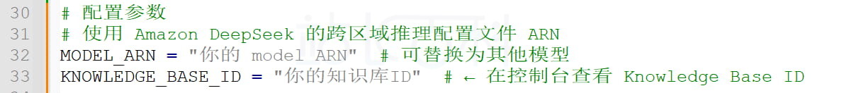 bedrock_agent = session.client(“bedrock-agent-runtime”)# 配置参数