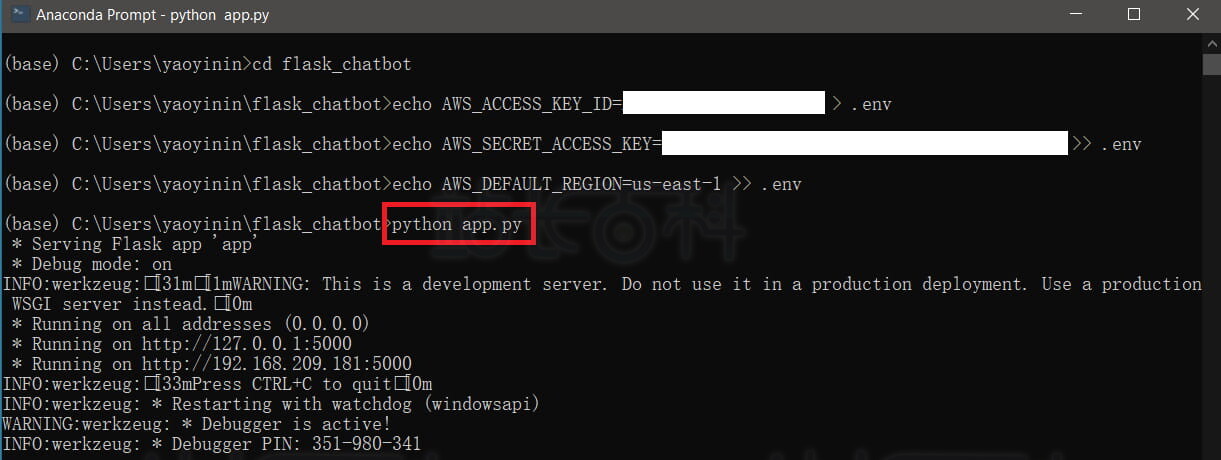 现在已经成功配置了 Flask 应用,并集成了 Amazon Bedrock 上的 DeepSeek 模型和企业知识库。可以通过以下命令在 Anaconda Prompt 中运行 app.py 文件,启动智能客服系统。