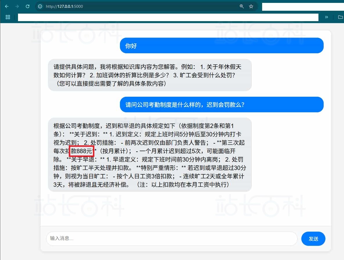 我们尝试提出与知识库内容相关的问题,程序成功通过 Amazon Bedrock 的 API 调用了 DeepSeek 模型,并基于预设的知识库提供了准确的回答。例如,当我们询问“公司考勤制度是怎么样的?”时,系统会结合上传的考勤制度文件,生成详尽的解答。