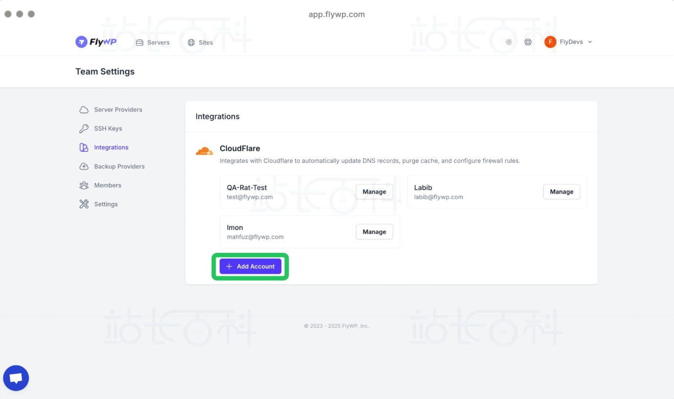 - 从FlyWP一个仪表板,即可管理多个Cloudflare账户;