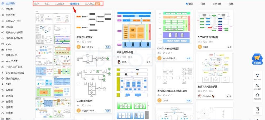 支持根据模板的“推荐、热门、最多克隆、最新发布、达人作品”分类,筛选查看。支持根据模板的“免费、VIP免费、付费、全部”分类,筛选查看。