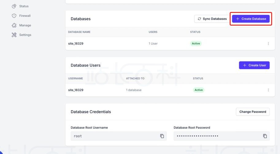 - 在这台服务器的左侧栏里,点击“Database”(数据库),就能进入数据库管理页面了。