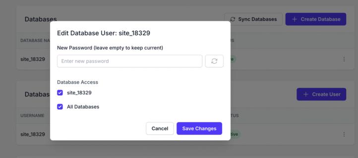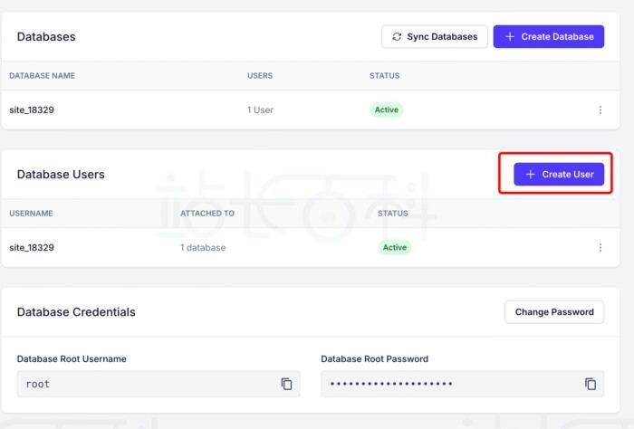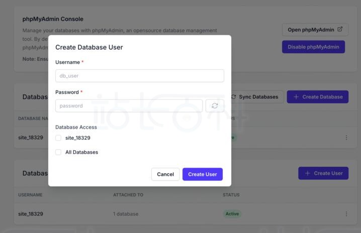 - Database Access(数据库访问权限):勾选用户能访问的数据库(比如勾选“site_18329”),也可以选“所有数据库”,让用户能访问当前和未来所有数据库(谨慎使用这个选项);