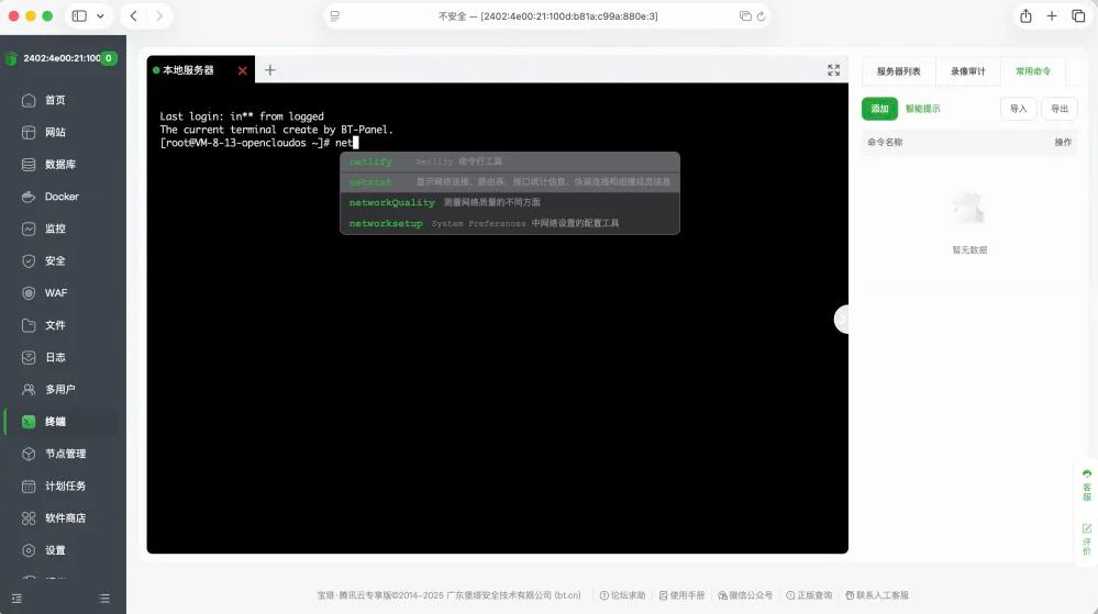 最后给大家提个醒,宝塔面板主体已全部完成对IPv6的兼容,部分云厂商功能相关的插件因云厂商API服务入口不支持IPv6链路导致单栈网络环境下无法使用,大家碰到此类问题请及时向相关云厂商提交工单反馈,共同推动对单栈IPv6网络的支持。