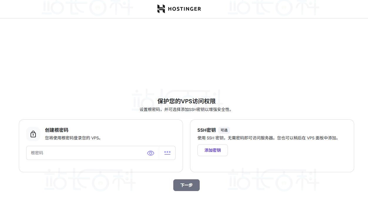 设置root密码和SSH密钥(可选),密码必须包含大写字母+小写字母+数字+特殊符号,避免简单密码被暴力破解;而SSH密钥(可选)初期可暂不设置,后续进入hPanel中补充添加,比密码登录更安全。