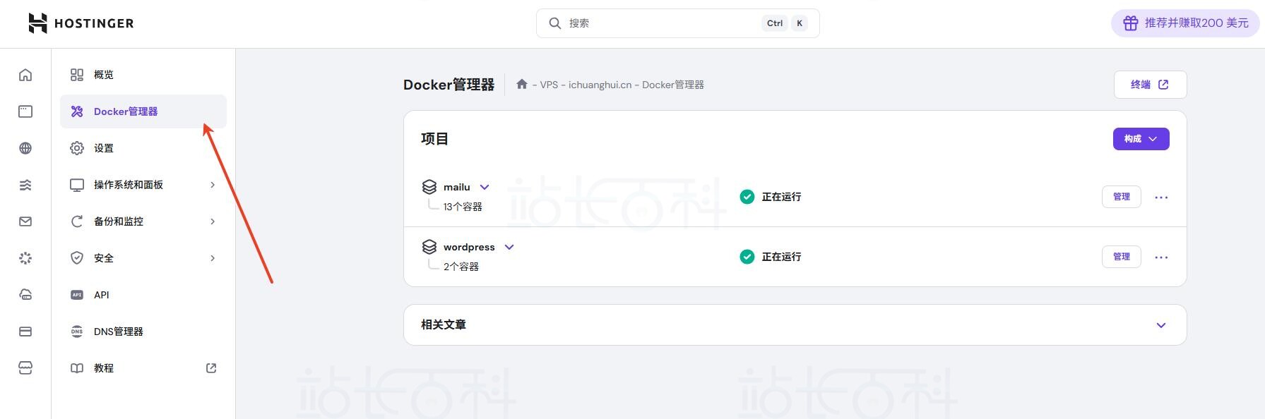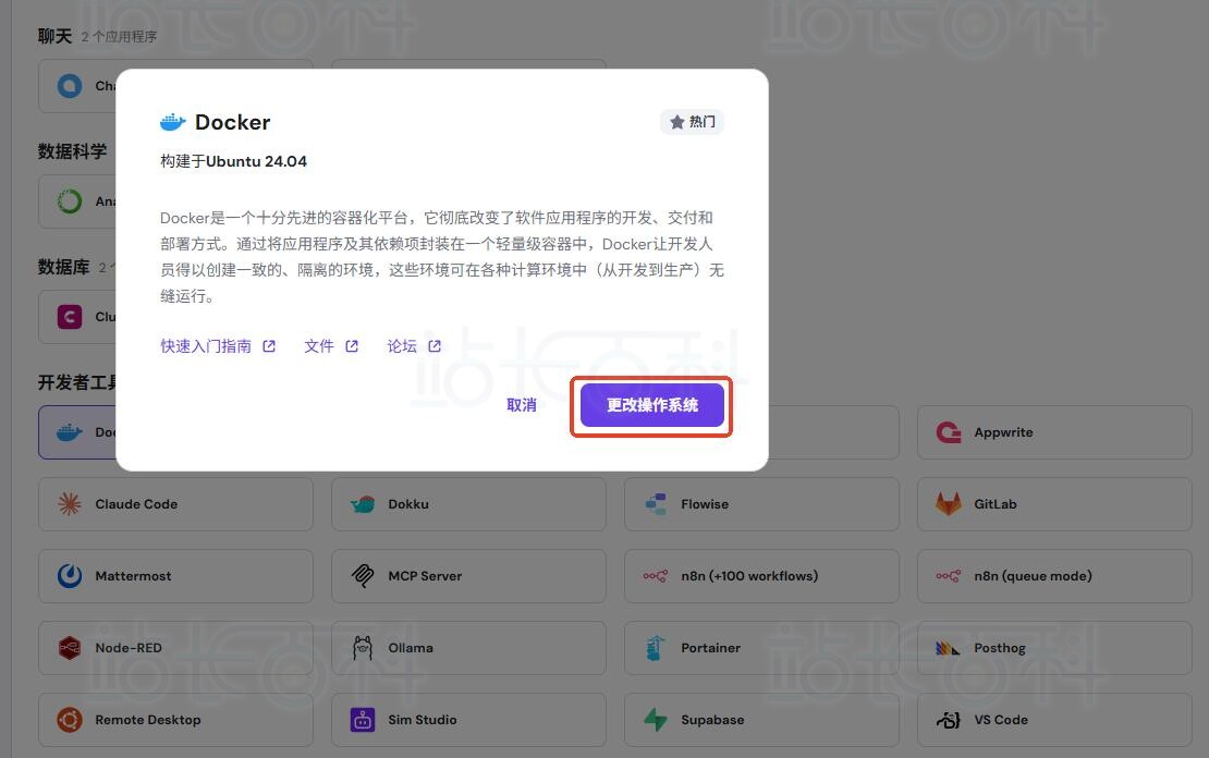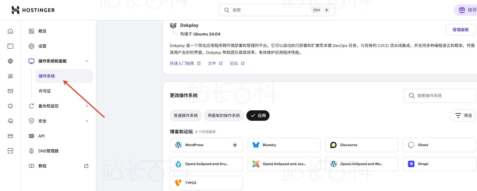 进入hPanel的VPS管理页,点击左侧“操作系统”>“应用”,找到“Docker”选项,点击“更改操作系统”;。
