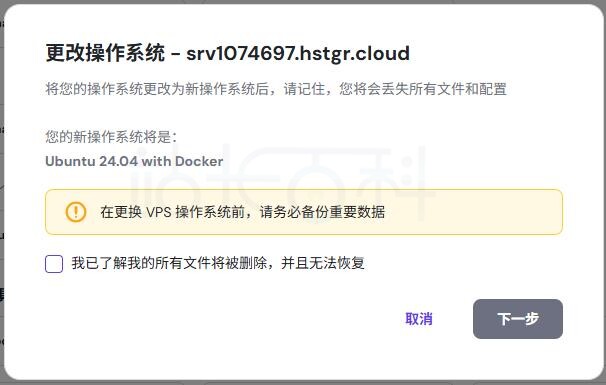 因新VPS无数据,直接点击“确认更换”,等待3分钟左右,系统会自动安装Docker环境。