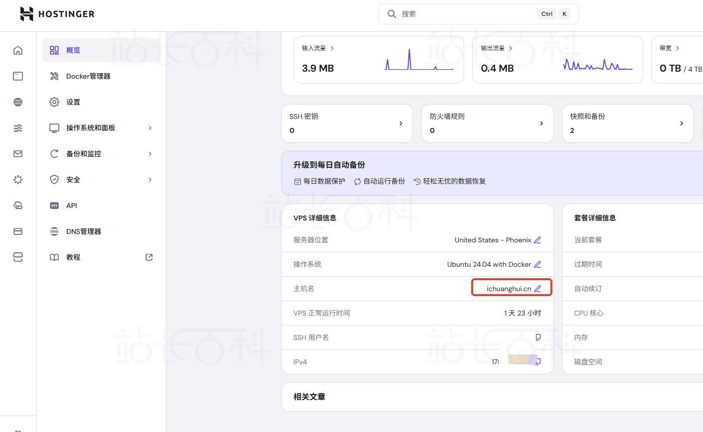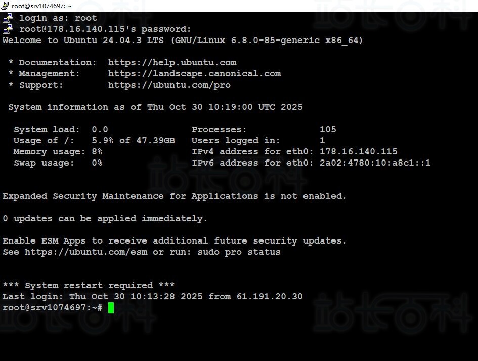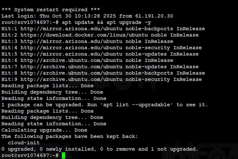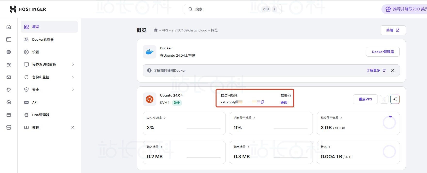 看到服务器出现“root@srv1074697:~#”等符号就说明可以开始安装docker和docker compose了。Hostinger VPS已自带Docker镜像,因此无需再次安装Docker。